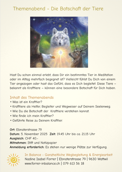 Die Botschaft der Tiere. Tiere als Teil unseres Seelenweges, Symbolik, Reise zu Deinem Krafttier (siehe Flyer unten).